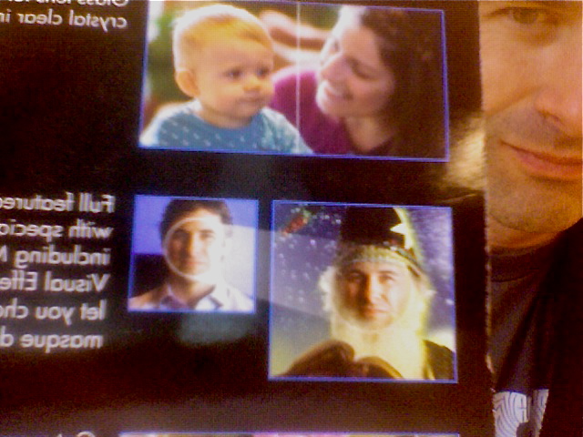 So, on the packaging is a series of ‘What you can do with your webcam’ images and descriptions.  You can create clear shots of motion (person playing a guitar – not me); someone holding a baby, also not me.  Finally, here’s me.  But no hiker (“Ah, this fresh air does wonders for my entrancing handsomeness”), no restaurant owner (“Could I interest monsieur in a low-carb, tofu wrap?”).  You see, with this webcam you can also create a fake image around your face, effectively putting your face on another body.  So there’s me, in a cropped head shot, and I have apparently elected to put my face on a wizard’s body.