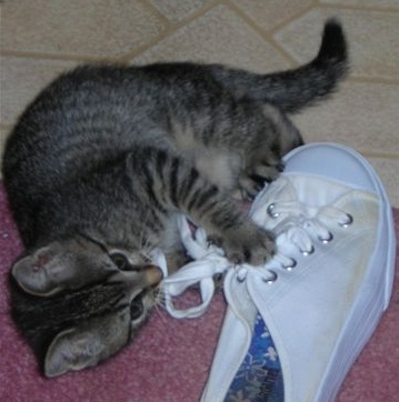 (He doesn’t respond. He is watching her untie her shoes with fascination. He stares at the laces, his eyes getting wider and wider. Finally, he grabs her shoe by the laces and pulls it from her foot)