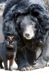 So, one day at the Berlin zoo, employees got to work and when they got to big, furry bear Mauschen’s pen, they discovered a cat sitting in there. Just sitting there, next to the bear with that ‘Yes? Do you need something?’ look that cats have. They had no idea where it had come from or how it gotten in. Employees were concerned, but didn’t know what to do about it. The cat stayed. And stayed. And stayed.