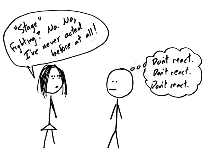 No experience. She was apparently a lead actress of the classical mold – meaning her lack of acting training was unimportant because she had a terrific body. This is not to slight her natural acting ability (I didn’t really get to see it), but I began trying to think of how to teach stage fighting in 10 minutes. I also began to see the process in motion behind the scenes. And so I got concerned.