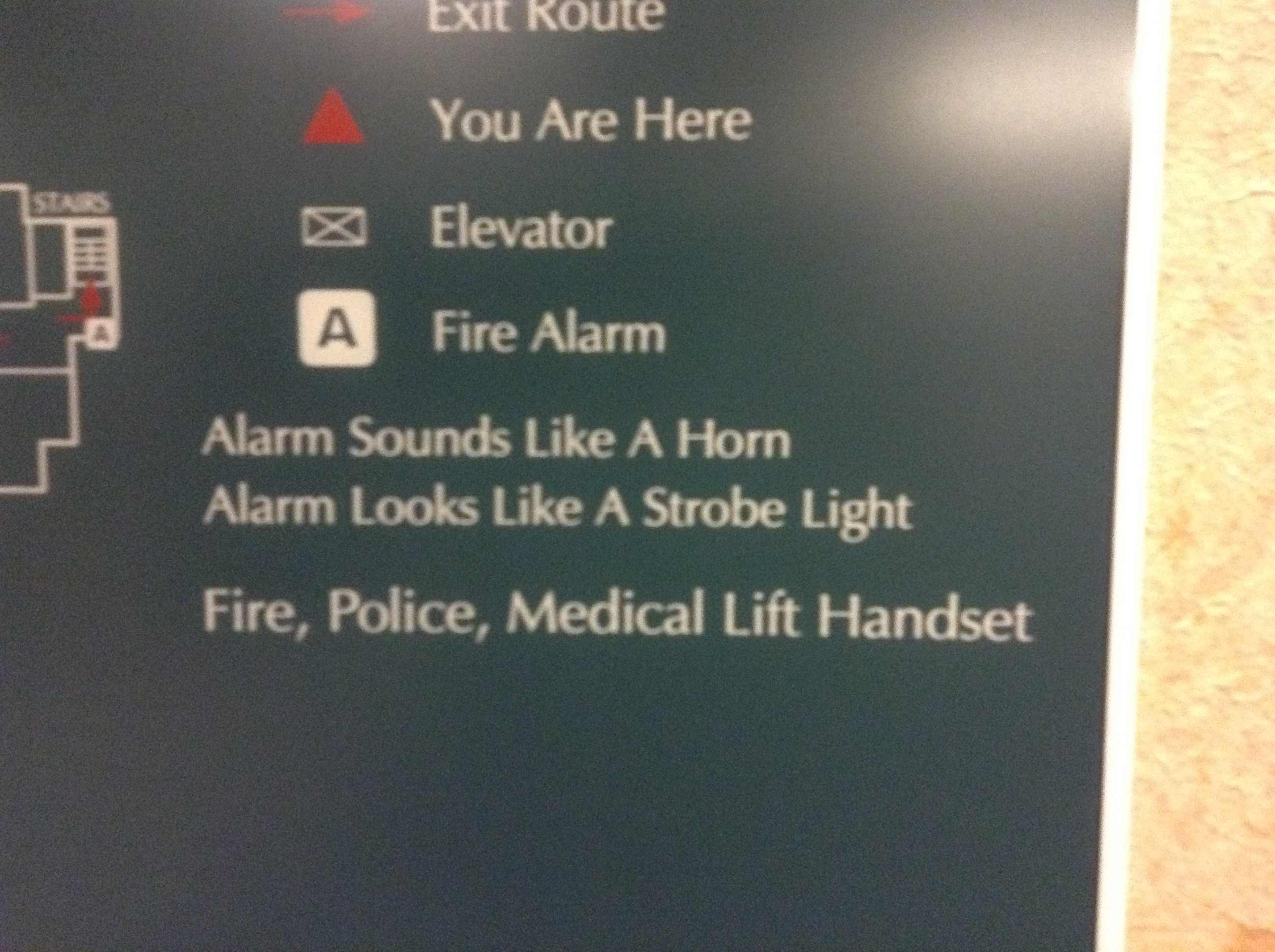 Signs like those confuse me anew at each re-read: “Fire, Police, Medical Lift Handset”.